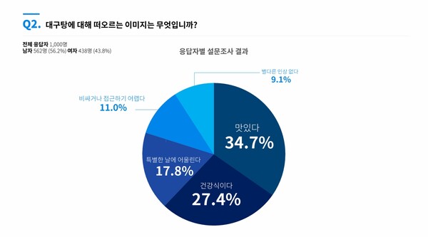 [데일리한국 민병무 기자] 한주에이알티는 최근 론칭한 대구탕 전문 프랜차이즈 브랜드 ‘대구일색’과 관련해 소비자 인식 조사를 실시했다고 23일 밝혔다. 이번 조사는 모바일 설문 플랫폼 크라토스를 통해 전국 10대부터 60대 이상까지의 일반인 1000명을 대상으로 진행됐으며, 한식 프랜차이즈에 대한 인식과 수요, 전통 한식 메뉴에 대한 이미지 및 이용 의향 등을 파악하기 위한 5개 문항으로 구성됐다.
