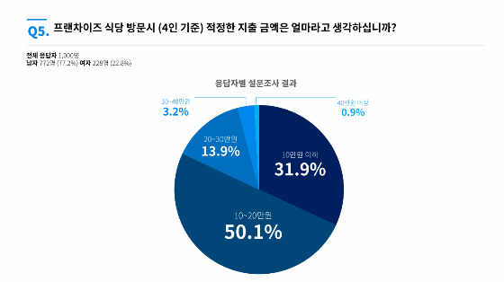 프랜차이즈 식당 외식 소비 행태 조사에서 국민 절반 이상이 4인 기준 외식비로 10만~20만원이 적절하다고 응답한 설문 결과가 나왔다.